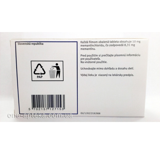 склад: 1 таблетка містить 10 мгмемантину гідро хлориду (еквівалентно 8,31 мг мемантину); допоміжні речовини: лактози моногідрат, целюлоза мікрокристалічна, силікагель колоїдний безводний, тальк, магнію стеарат, сополімер метакрилової кислоти та етил акрилату (1:1), натрію лаурилсульфат, полісорбат 80, триацетин, емульсія симетикона.