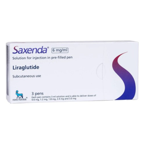 Способ введения. Препарат Саксенда предназначен только для подкожного введения. Его нельзя вводить в/в или в/м. Препарат вводится подкожно 1 раз в сутки в любое время независимо от приема пищи. Его можно вводить подкожно в область передней брюшной стенки, бедра или плеча. Место и время введения можно менять без коррекции дозы, однако желательно вводить примерно в одно и то же удобное время. Для дополнительной информации по введению см. раздел Инструкция по использованию шприц-ручки. Инструкция по использованию шприц-ручки Саксенда, 6 мг/мл, раствор для инъекций в предварительно заполненной шприц-ручке Необходимо внимательно ознакомиться с инструкцией перед использованием шприц-ручки Саксенда. Не использовать шприц-ручку без получения достаточной информации об ее использовании от врача или медсестры. Применение препарата следует начинать с проверки шприц-ручки, чтобы быть уверенным, что она содержит именно препарат Саксенда, 6 мг/мл, затем следует ознакомиться с рисунками ниже, чтобы узнать различные части шприц-ручки и иглы. Если у пациента плохое зрение или он вообще не видит, можно использовать шприц-ручку без посторонней помощи. Помогать должен человек с хорошим зрением, который может видеть дозовый счетчик на шприц-ручке Саксенда и умеет пользоваться ею. Шприц-ручка Саксенда предварительно заполнена. Она содержит 18 мг лираглутида, что позволяет вводить дозы 0,6 мг, 1,2 мг, 1,8 мг, 2,4 мг и 3,0 мг. Шприц-ручку Саксенда предназначена для использования с одноразовыми иглами НовоФайн или НовоТвист длиной до 8 мм и толщиной 32G.