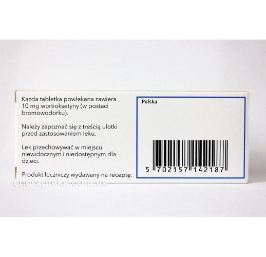 1 таблетка содержит 10 мг вортиоксетина в виде вортиоксетина гидробромида.